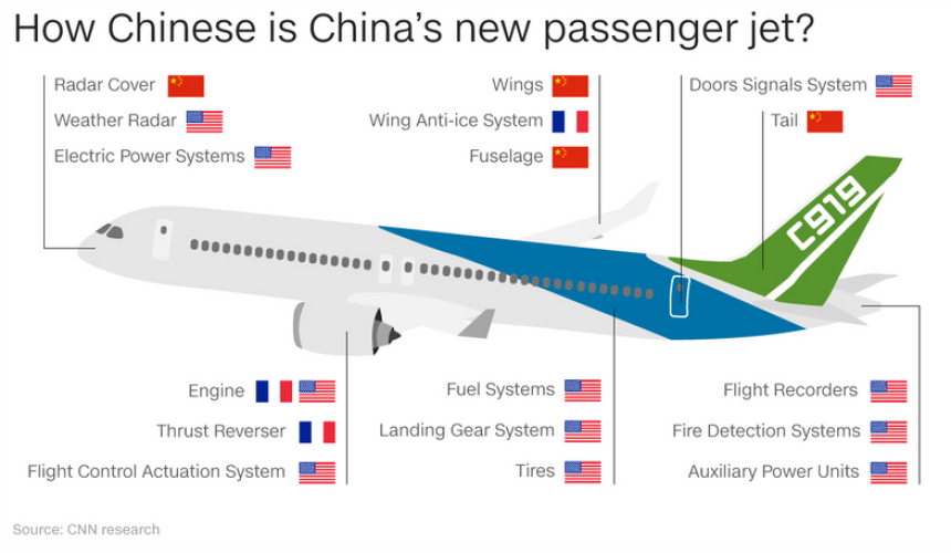 Ωστόσοι ορισμένοι είναι σκεπτικοί αναφορικά με τις δηλώσεις ότι το C919 είναι αμιγώς κατασκευασμένο στην Κίνα. Το CNN δημοσίευσε την παρακάτω εικόνα, η οποία δείχνει ότι πολλά τμήματα του C919 κατασκευάζονται στην Αμερική.