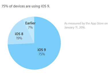 Η Apple ανακοίνωσε τα ποσοστά των εκδόσεων του mobile λειτουργικού συστήματος που βρίσκονται στις φορητές συσκευές της, αποκαλύπτοντας ότι η έκδοση 9 του iOS, βρίσκεται στο 75% των συμβατών συσκευών.