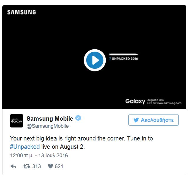 Επισημοποιήθηκαν τα σχέδια της Samsung, όσον αφορά την ονομασία και την ημερομηνία παρουσίασης του νέου της ταμπλετοτηλέφωνου, Galaxy Note 7, η οποία, σύμφωνα με tweet της εταιρείας, θα πραγματοποιηθεί στις 2 Αυγούστου, στη Νέα Υόρκη.