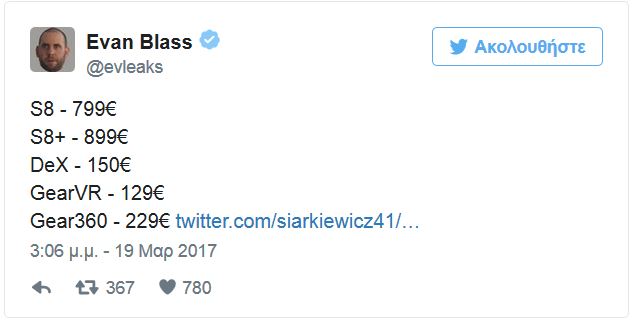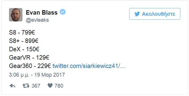 Σε ξεχωριστό επίσης tweet, ο ίδιος leaker έκανε γνωστές και τις Ευρωπαϊκές τιμές των νέων συσκευών της εταιρείας, συμπεριλαμβανομένων και του DeX Station (πρόκειται για μία βάση σαν αυτή που προσφέρει η Microsoft στα κινητά της Lumia 950 και 950 XL που χαρίζει χαρακτηριστικά “Continuum” στην συσκευή της Samsung) αλλά και του νέου Gear VR και του Gear 360.