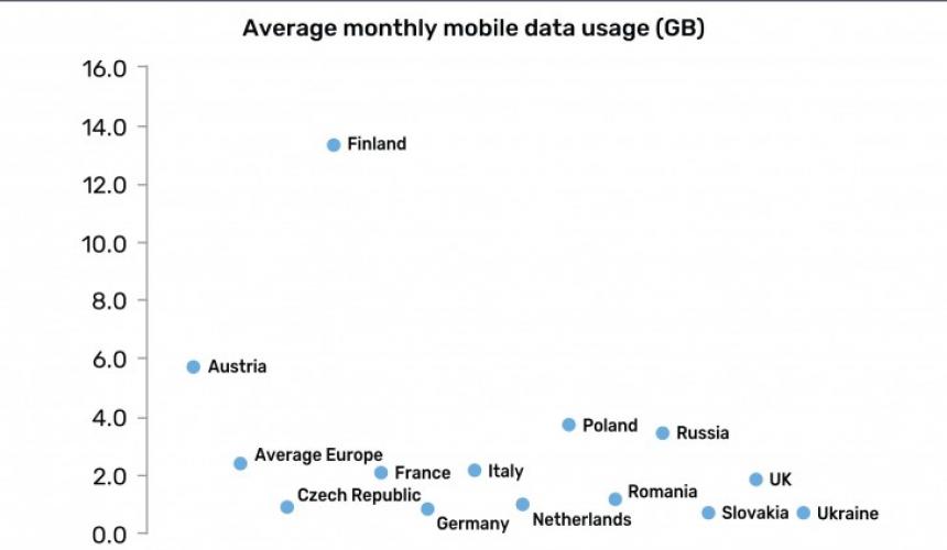 Ανάμεσα στους Ευρωπαίους, οι Φινλανδοί βρέθηκαν στη πρώτη θέση, καταναλώνοντας περίπου 13,3GB ανά SIM, ποσότητα δεδομένων κινητής τηλεφωνίας που είναι διπλάσια σχεδόν από εκείνη που καταναλώνουν οι… δεύτεροι στην κατάταξη Αυστριακοί, που είναι 5,7GB ανά SIM. Οι Πολωνοί και οι Ρώσοι με 3,7GB και 3,5GB ανά SIM ήταν επίσης στις κορυφαίες θέσεις της κατάταξης όσον αφορά στην κατανάλωση δεδομένων.