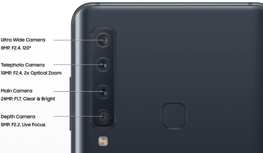 Όπως φαίνεται και από την εικόνα, η βασική κάμερα του Galaxy A9 θα έχει αισθητήρα 24MP με F1.7 για καθαρές και φωτεινές φωτογραφίες. Περνώντας στις δευτερεύουσες κάμερες, θα υπάρχει μια κάμερα βάθους των 5MP με F2.2 για το live focus και μια telephoto camera των 10MP με F2.4 για το 2x οπτικό zoom. Τέλος, υπάρχει και μια ultra wide κάμερα των 8MP με F2.4 για λήψεις 120 μοιρών.