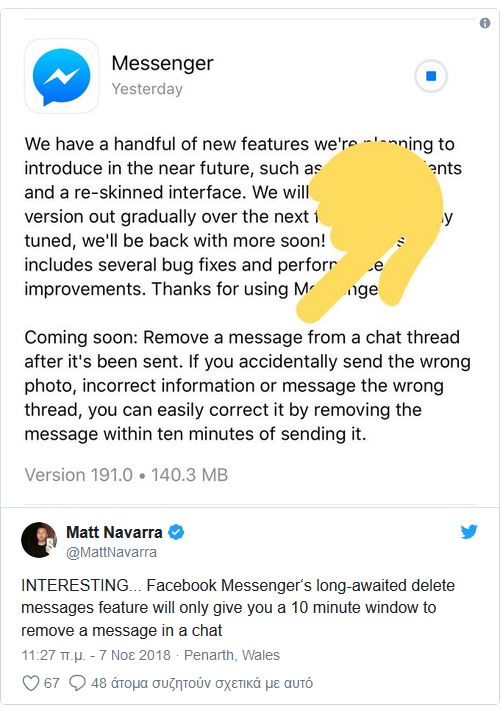Το νέο αυτό χαρακτηριστικό που «έρχεται σύντομα» παρατήρησε πρώτος ο χρήστης του Twitter @MattNavarra στις σημειώσεις έκδοσης για την έκδοση 191.0 του client του Messenger για το iOS.