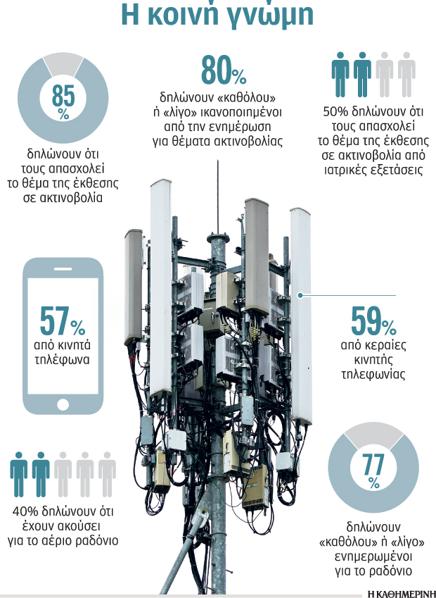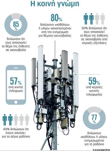 Σε ποσοστό 85% οι Ελληνες δηλώνουν ότι τους απασχολεί η έκθεσή τους σε ακτινοβολία, ενώ το 79% ανησυχεί για τις πιθανές επιπτώσεις αυτής της έκθεσης στην υγεία. Οι πηγές ηλεκτρομαγνητικής ακτινοβολίας που προκαλούν τη μεγαλύτερη ανησυχία είναι οι κεραίες κινητής τηλεφωνίας και τα κινητά τηλέφωνα, ενώ πέντε στους δέκα πολίτες δηλώνουν ότι τους απασχολεί η έκθεσή τους σε ακτινοβολία από ιατρικές εξετάσεις.