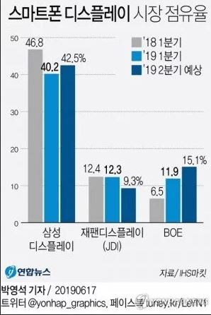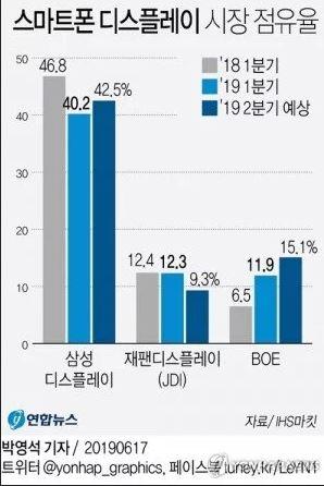 Η JDI (Japan Display International) παρέμεινε επίσης στην δεύτερη θέση, αν και μακριά από την Samsung, με ποσοστό 12,3% στην αγορά ενώ η BOE φαίνεται πως είναι η μεγαλύτερη κερδισμένη, αφού διπλασίασε το ποσοστό της φτάνοντας το 11,9% και φαίνεται πως έχει την ορμή να ξεπεράσει εύκολα την JDI μέσα στο δεύτερο τρίμηνο της χρονιάς σύμφωνα με εκτιμήσεις της IHS Markit.
