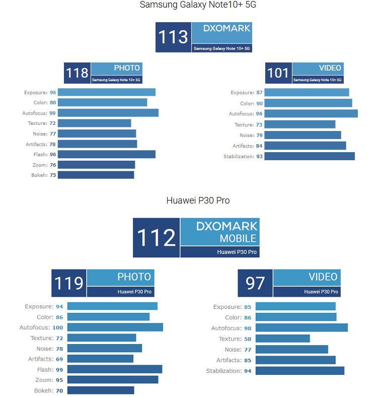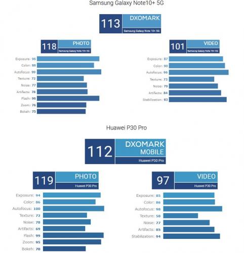 Η συνολική βαθμολογία για την κύρια κάμερα είναι «113», μόλις δηλαδή ένα βαθμό υψηλότερη από την βαθμολογία του Huawei P30 Pro. Στον τομέα της φωτογραφίας (Photo), το Galaxy Note10+ 5G μάλιστα έχει βαθμολογηθεί με 118, ένα βαθμό δηλαδή χαμηλότερα από ότι το Huawei P30 Pro, ωστόσο στον τομέα του βίντεο (Photo), το κινητό της Samsung έχει βαθμολογηθεί με 101, τέσσερις βαθμούς παραπάνω από το Huawei P30 Pro (97).