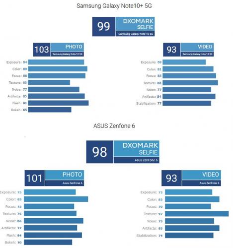 Με βαθμολογία 99 για την «Selfie» κάμερα, το Samsung Galaxy Note10+ 5G εκτόπισε από την κορυφή το ASUS Zenfone 6. Στον τομέα της φωτογραφίας, η κάμερα του Note10+ 5G βαθμολογήθηκε με 103 (101 το Zenfone 6) και στον τομέα του βίντεο βαθμολογήθηκε με 93 (όπως και το Zenfone 6). Η εμπρόσθια κάμερα του Galaxy Note10+ 5G αποδίδει εξαιρετικά σε όλες τις συνθήκες φωτισμού και οι δυνατότητες αυτόματης εστίασης που διαθέτει είναι από τις καλύτερες, αν και το «bokeh» έχει περιθώρια βελτίωσης. Να αναφέρουμε, ότι το μικρότερο Galaxy Note10 (τόσο στην LTE όσο και στην 5G έκδοση) διαθέτει ακριβώς την ίδια κάμερα, και επιπλέον έχει ακριβώς την ίδια κύρια κάμερα, με εξαίρεση τον 3D ToF αισθητήρα (ο τελευταίος πάντως δεν παίζει και τόσο μεγάλο ρόλο στις δοκιμές του DxOMark).