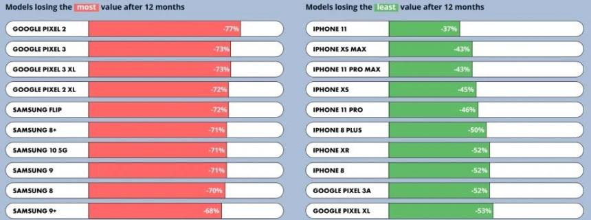 Η αναφορά δείχνει πως τα iPhone κρατούν μεγαλύτερη αξία με την πάροδο του χρόνου. Μετά από 24 μήνες χάνουν το 66% της αξίας τους, ενώ τα Samsung Galaxy το 79% και στο 80% είναι τα OnePlus και τα Pixel.