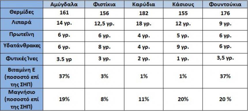 Δείτε παρακάτω τον πίνακα με τη θρεπτική αξία των παραπάνω καρπών: