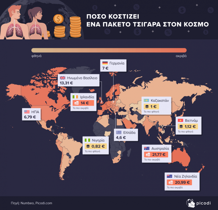 Η Νέα Ζηλανδία (21 € ανά πακέτο), η Ιρλανδία (14 €) και η Μεγάλη Βρετανία (13,3 €) συγκαταλέγονται επίσης στις χώρες με τα πιο ακριβά τσιγάρα.