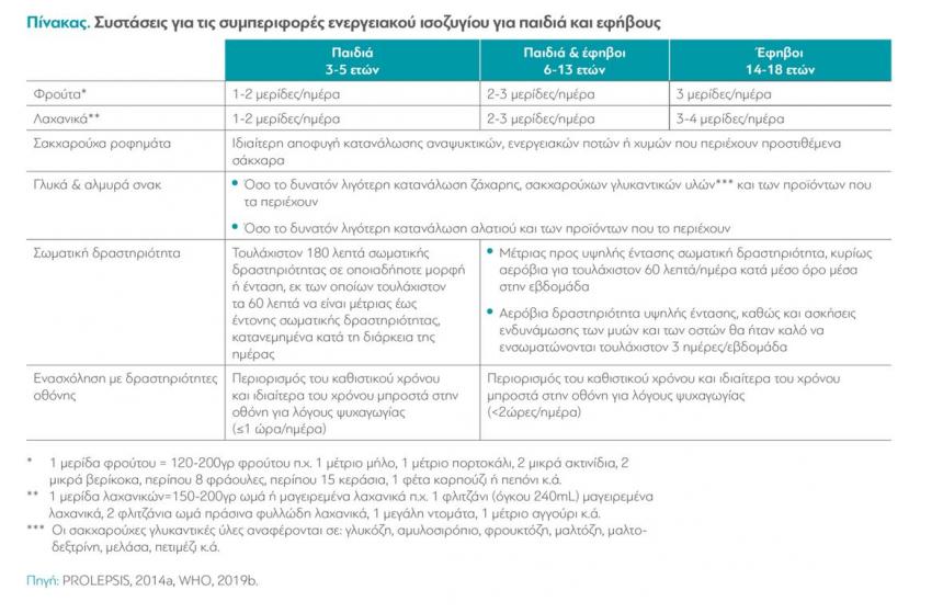 Τι γίνεται, όμως, με τα παιδιά; Στον παρακάτω πίνακα εμφανίζονται οι συστάσεις για τη διατροφή και τη δραστηριότητα παιδιών διάφορων ηλικιών.