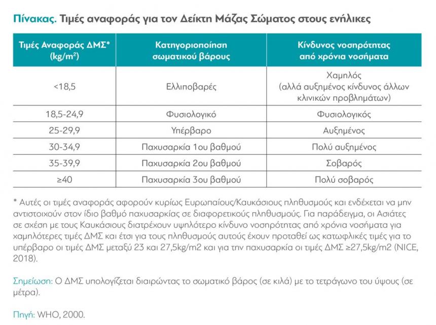 Το αν ένα άτομο είναι παχύσαρκο, υπέρβαρο ή όχι υπολογίζεται με τη μέτρηση του σωματικού του λίπους. Ωστόσο, επειδή αυτή είναι δύσκολη διαδικασία που χρειάζεται εξειδικευμένο εξοπλισμό, γι’ αυτή τη δουλειά κατά κανόνα χρησιμοποιείται ο “Δείκτης Μάζας Σώματος” (o γνωστός με το αγγλικό αρκτικόλεξο “BMI”), που μετρά το σωματικό βάρος σε σχέση με το ύψος, εκτιμώντας έτσι έμμεσα τη συσσώρευση λίπους στο σώμα. Ο BMI υπολογίζεται αν διαιρέσουμε το σωματικό βάρος σε κιλά με το τετράγωνο του ύψους σε μέτρα. Για παράδειγμα, ένα άτομο με ύψος 1,75 μέτρα και βάρος 70 κιλά έχει BMI 22,9. Όπως φαίνεται και από τον παρακάτω πίνακα, που αφορά κυρίως στα σώματα ενηλίκων Ευρωπαίων/Καυκάσιων, άτομα με ΒΜΙ άνω του 25 λογίζονται ως υπέρβαρα και άτομα με ΒΜΙ άνω του 30 ως παχύσαρκα (σε άτομα άλλης εθνοτικής καταγωγής τα όρια είναι ελαφρώς διαφορετικά). Μπορείτε να υπολογίσετε τον BMI σας τώρα, και να δείτε σε ποια κατηγορία εμπίπτετε.