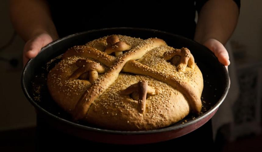 Στη συνέχεια βουτυρώνουμε ένα ταψάκι και το αλευρώνουμε τινάζοντας να φύγει η περισσή ποσότητα. Βάζουμε μέσα τη ζύμη μας και με λίγο ζυμάρι που έχουμε κρατήσει φτιάχνουμε δύο κορδόνια τα οποία τοποθετούμε πάνω στο ψωμί σε σχήμα Σταυρού. Στολίζουμε με καρύδια ή αμύγδαλα, πασπαλίζουμε με το σουσάμι και βάζουμε να ψηθεί σε προθερμασμένο φούρνο στους 180 βαθμούς για περίπου μια ώρα.