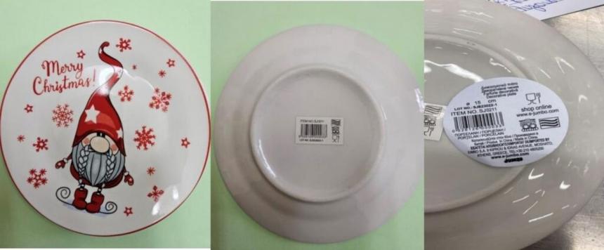 Κινέζικο πιάτο από πορσελάνη με χριστουγεννιάτικη διακόσμηση, στο οποίο διαπιστώθηκαν αυξημένα επίπεδα απελευθέρωσης καδμίου, ανακαλεί από την αγορά ο Ενιαίος Φορέας Ελέγχου Τροφίμων.